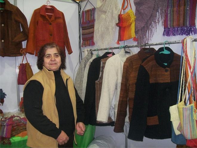 Participando hace más de veinte años Lila Adil, nos trasmite el calor de sus tejidos, aprendió su arte desde muy chiquita , siguiendo los pasos de madre, en ningún minuto dejo el tejido que estaba haciendo a dos agujas , y solo miraba cuando la gente preguntaba por sus prendas, levantándose con una gran sonrisa, muestra lo que sus laboriosas manos producen en su querida Santa María, en el telar que posee realiza sus obras de arte, como ser Sacos de lana de oveja y llama, Bufandas, Chalecos, Mantas, Chales, Gorros, Caminos de mesa Almohadones, Bolsos, Ruanas, todos los mismos teñidos con colores , naranjas , verdes, en tonos pasteles, demostrando en ellos el color de su alma.