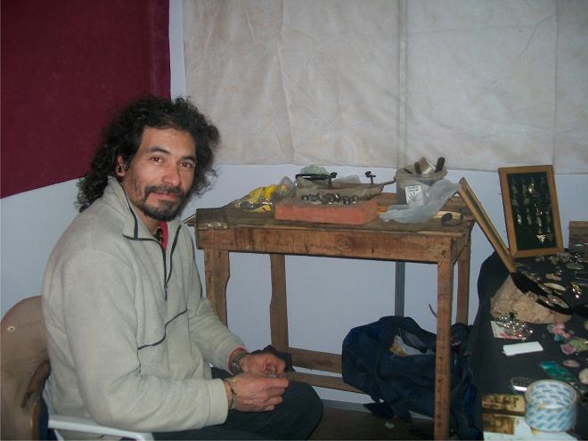 “Trabajo mayormente que lo que es bijouterie, aros, pulseras, colgantes, muy poco escultura, más salida con este tipo de mercado con la rodocrosita: el mercado de la piedra es muy amplio se pueden hacer infinidades de cosas, con lo que mejor me va es con la bijouterie”, manifestaba este joven artesano de la “perla del Oeste”.
