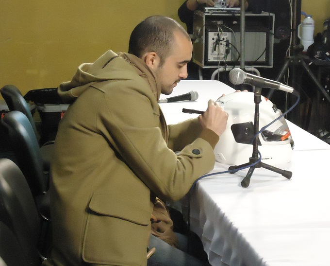 El cantante Abel Pintos se sumó a la campaña de seguridad vial, antes de subir al escenario mayor “Jorge Negro Herrera”. Firmó un casco, al igual que lo hicieron otros artistas, con el objetivo de fomentar la utilización del casco para los motociclistas.