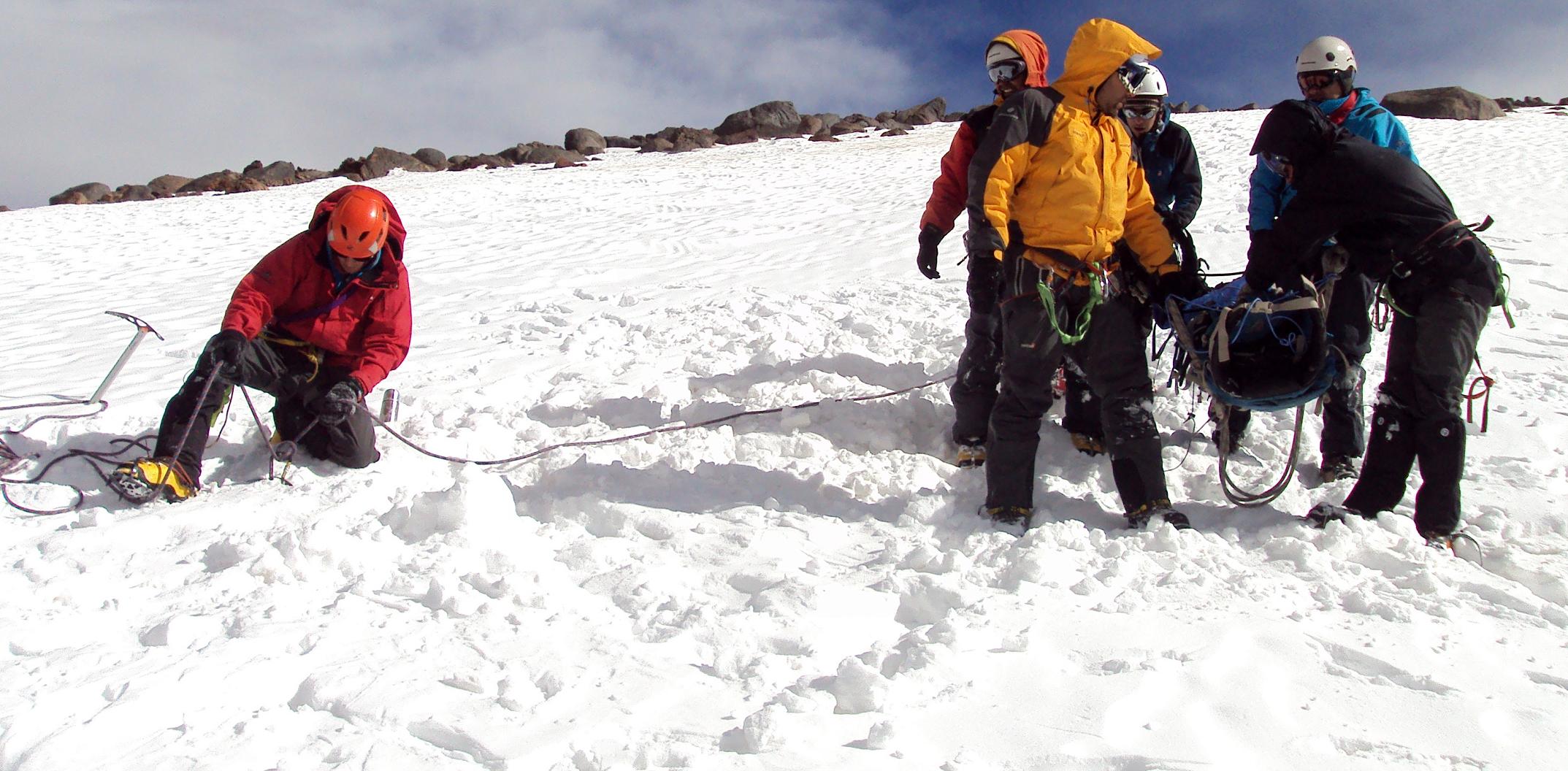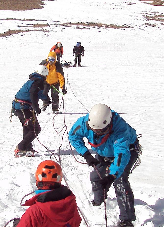 (Anclajes en nieve, armado de camilla con cuerda, asistencia al herido, poleas de rescate, transporte y travesía con camilla y cuerdas en la pendiente, trabajo en equipo).