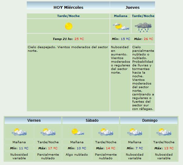 Según el Servicio Meteorológico Nacional, para mañana están previstas lluvias en la tarde noche. Asimismo, la temperatura comenzará a descender paulatinamente, y para el domingo se espera una mínima de tan sólo 7° y una máxima de 13°.