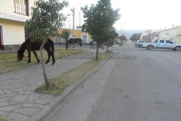 Ayer, los equinos estaban en la esquina de calles Tucumán y Copiapó, pasteando frente a una casa. Vecinos del lugar reclamaron su captura por parte de las autoridades del Municipio, y su traslado a un corralón acondicionado para su permanencia. Foto: Voces Escritas.