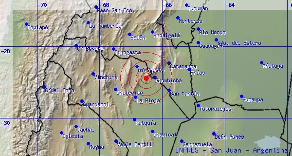 El epicentro se ubicó a 65 Km. al noreste de la ciudad capital de La Rioja con una profundidad de 56 Km. y una magnitud de 4.2 en la escala de Ritcher.