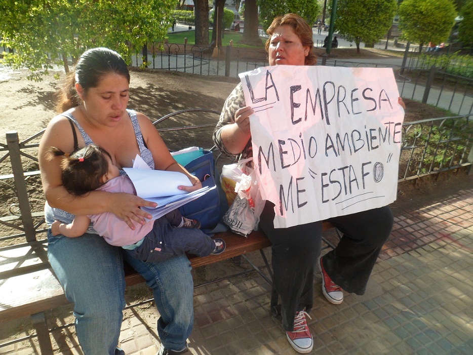 En plaza 25 de Mayo, Rosa Ángela Navarro, de 42 años, con domicilio en el barrio Santa Marta, se manifestó protestando en contra de una empresa de medio ambiente, la cual no le realiza el depósito judicial desde hace ya un año por un monto de mil pesos mensuales.