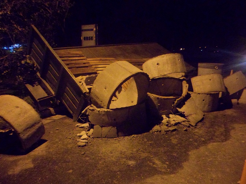 El camión volcó un carro que era tirado por una camioneta perteneciente al Corralón IECO, que transportaba anillos de cemento para pozo ciego.