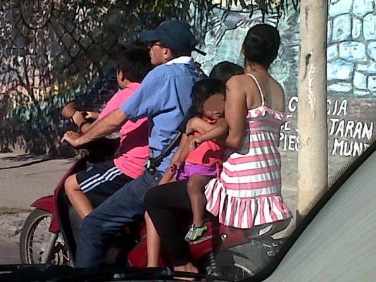 La foto fue tomada ayer en la avenida Mariano Moreno, en horas del mediodía, cuando este sujeto circulaba transportando a cuatro personas, entre ellos, dos menores de corta edad sostenidos por su madre uno en cada brazo.