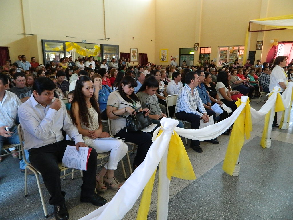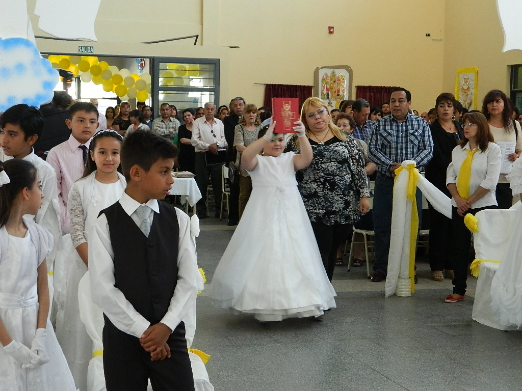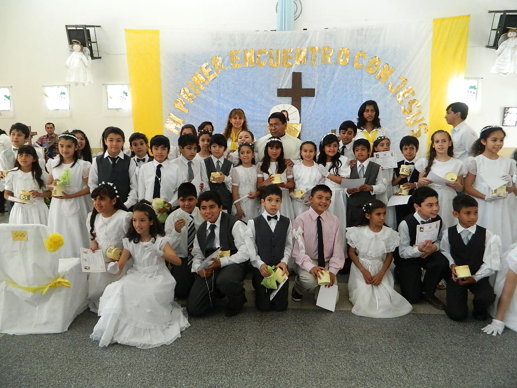 La Santa Misa fue presidida por el Párroco, Pbro. Rogelio Suárez, en el amplio salón cubierto de la escuela Revolución de Mayo, ubicada en el sur de la ciudad capital, bellamente adornada para la ocasión. En el transcurso de la misma tuvieron particular participación las familias de los pequeños, algunas de las cuales tuvieron a su cargo de la lectura de la Palabra de Dios y acercaron las ofrendas hasta el altar.