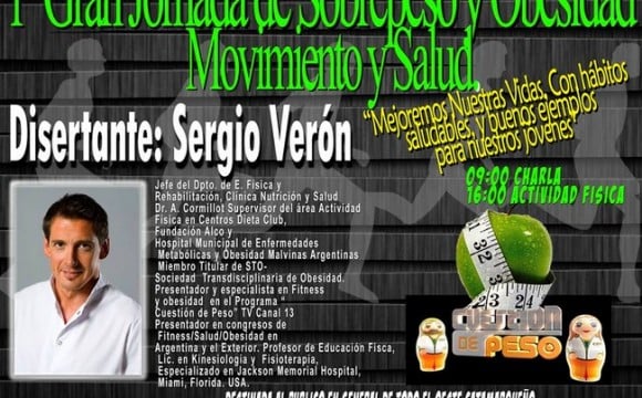 \"Les cuento que viene el Lic. Sergio Verón a disertar en esta jornada, todos lo pueden conocer como referencia del programa de TV Cuestión de Peso, trabaja con el Dr. Alberto Cormillot en su clínica y tiene bastante experiencia con personas con sobrepeso y obesidad, tiene muchos conocimientos para compartir con las personas que quieran sacarse dudas o aprender de esta enfermedad, y por supuesto que hablará de otras enfermedades más como por ejemplo la diabetes, porque la obesidad está asociada a otra enfermedades más crónicas y una de ellas es la diabetes, cáncer entre otras, entonces es muy importante que se informen de que se trata esto, que no es una enfermedad aguda que pueden curarse de un día para otro, esto los va a acompañar hasta el último día de su vida, tienen que saber muy bien que complicaciones trae, como pueden cambiar o revertir por lo menos para que no se les despierte otra enfermedad crónica y cambiar sus hábitos”, detalló.