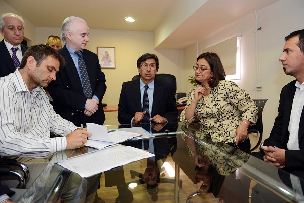 El acto tuvo lugar en las oficinas del Ministerio de Servicios Públicos de la provincia, en el CAPE (Centro Administrativo del Poder Ejecutivo), con la presencia del titular de esa cartera, Ing. Luis Romero; los firmantes del acuerdo el Director de Estudios y Proyectos de la Subsecretaría de Agua y Saneamiento, Ing. Carlos Eduardo Carrizo Soria, y el titular de empresa constructora Antonio Ignacio Salado Greco.