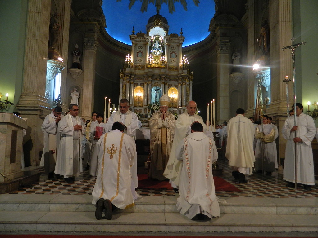 Seguidamente, Eduardo y Facundo se postraron humildemente para pedir la protección de todos los santos. Concluido el canto de las Letanías, se realizó la imposición de las manos del Obispo y de todos los sacerdotes en señal de acogida en el colegio presbiteral.