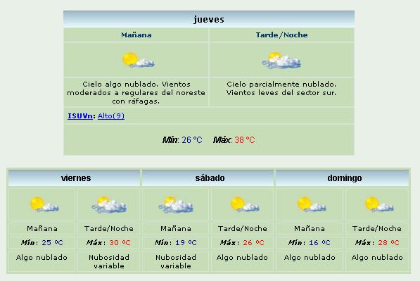 El sofocangte calor de hoy (el termómetro rozó los 40°), dará un respiro a los catamarqueños ya que el Servicio Meteorológico Nacional prevé para el Valle Central un descenso de la temperatura. Para el sábado y domingo el cielo estará algo nublado y se espera una máxima que podría llegar a los 30°. Conozca cómo estará el clima en los próximos días.