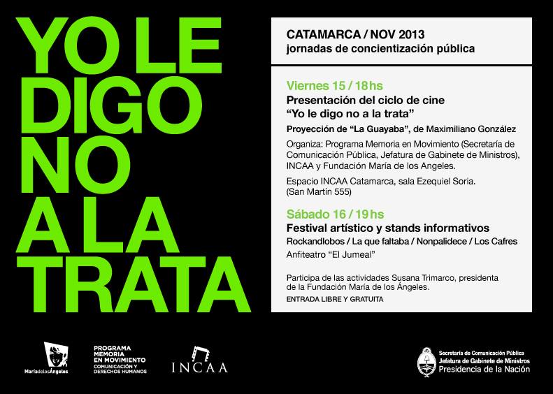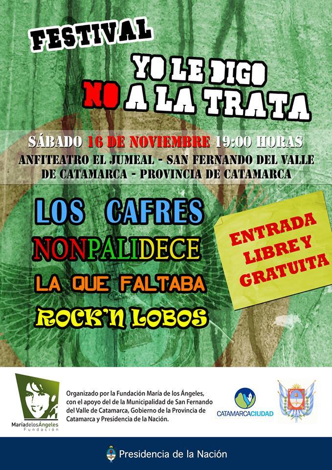 Cabe mencionar que para darle continuidad a las jornadas de concientización, el sábado 16 de noviembre en el anfiteatro de “El Jumeal” a partir de las 19 horas, también con la presencia de Susana Trimarco, se desarrollará el festival de rock “Yo le digo NO a la trata de personas” en el cual actuarán “Los Cafres”, “Nonpalidece”, “Rock and Lobos” y “La que faltaba”.