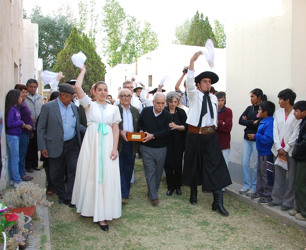 Minutos después, terminada la celebración religiosa, las cenizas de Margarita escoltadas por una guardia de bailarines, y acompañados por una multitud fueron llevadas hasta el mausoleo familiar, para convertirse en la última morada de la coplera. Así cantando coplas y vidalas, que hicieron emocionar a todos, los restos de Margarita Palacios fueron depositados en su nueva morada, y tras la despedida familiar y el descubrimiento de placas en su honor, los actos se trasladaron a la plaza principal, donde artistas locales festejaron el arribo de uno de los máximos referentes de la cultura provincial y argentina.