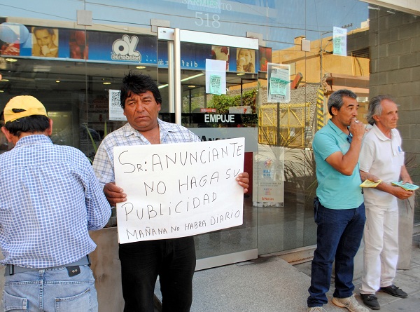 El reclamo de los canillitas nucleados en el sindicato de la actividad se hizo sentir ayer frente a la redacción y la planta impresora de El Ancasti, mediante la protesta de grupos de trabajadores encabezados por el secretario general del gremio, Juan Ochoa. En la vereda misma de la sede del matutino, los canillitas se expresaron mediante pancartas en las que se podía leer “Sr. anunciante no haga su publicidad, mañana (por hoy) no habrá diario”. También se manifestaban a través de volantes que entregaban a los peatones que circulaban por la calle Sarmiento, donde se leía “7 de noviembre, Día de DESCANSO para todos los canillitas del país…, la Ley nos ampara, Ley 26540, Fuerza Compañeros, apoyo total a la Ley de Medios”.
