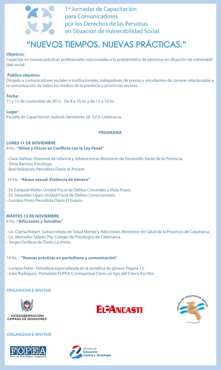 Organizada por la Vicegobernación de la provincia, el Diario El Ancasti y la Escuela de Capacitación Judicial (Poder Judicial de la Provincia) y auspiciada por el Foro de Periodismo Argentino (FOPEA) y el Ministerio de Educación, Ciencia y Tecnología de la Provincia, esta capacitación está dirigida a comunicadores sociales e institucionales, trabajadores de prensa y estudiantes de carreras relacionadas a la comunicación de todos los medios de la provincia y provincias vecinas, y tiene como objetivo proveer de conocimientos en nuevas prácticas profesionales relacionadas a la problemática de personas en situación de vulnerabilidad social.