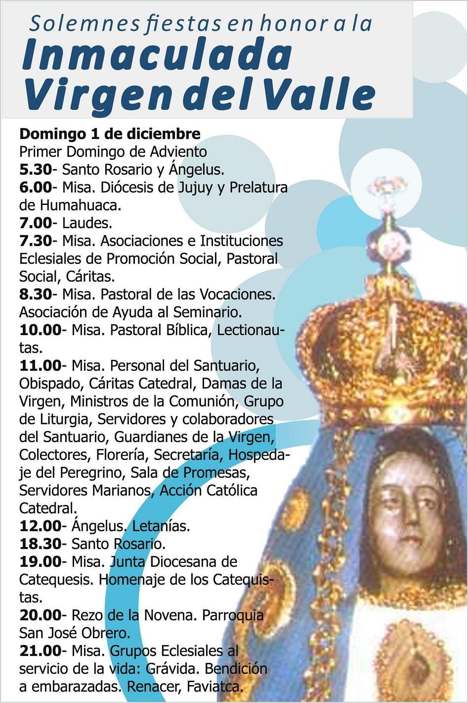 11.00- Misa. Personal del Santuario, Obispado, Cáritas Catedral, Damas de la Virgen, Ministros de la Comunión, Grupo de Liturgia, Servidores y colaboradores del Santuario Nuestra Señora del Valle, Sacristanes, Guardianes de la Virgen, Colectores, Florería, Secretaría, Hospedaje del Peregrino, Sala de Promesas, Servidores Marianos, Acción Católica Catedral.
