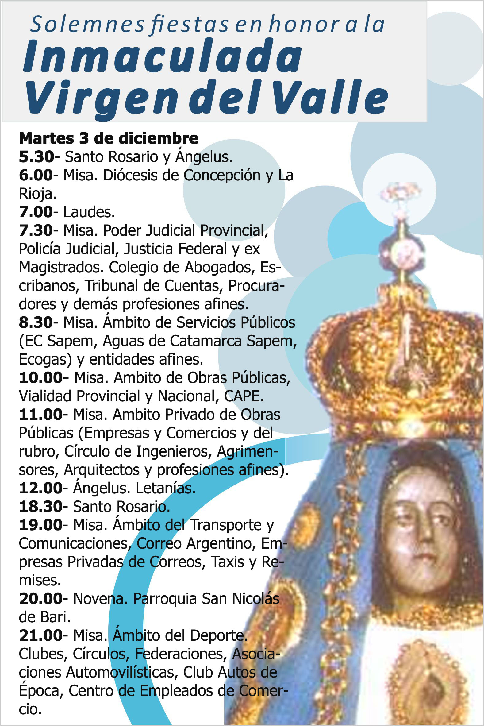 En la jornada de hoy, tendrán continuidad todas las actividades previstas por las festividades marianas. Programa para hoy martes 3 de diciembre.