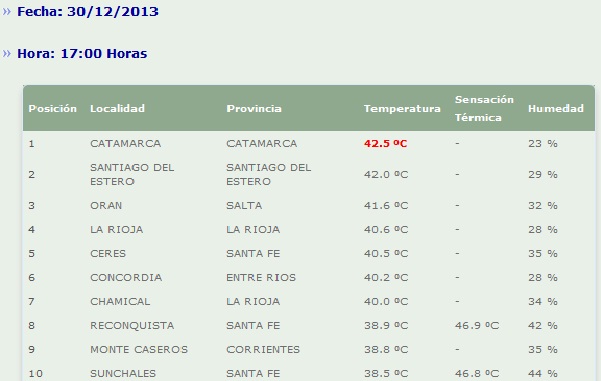 Temperatuas en el País. lunes, 30 de diciembre de 2013 00:00 lunes, 30 de diciembre de 2013 00:00 Luego de la Capital catamarqueña le siguieron en segundo lugar Santiago del Estero con 42°; Orán, en Salta, con 41,6° y cuarto La Rioja con 40,6°.