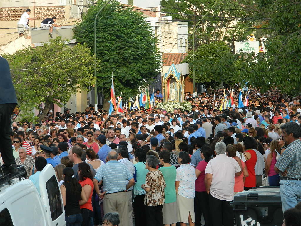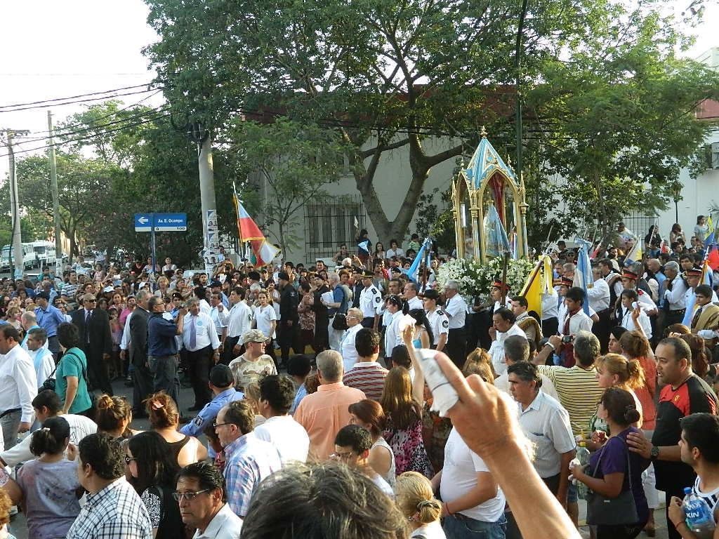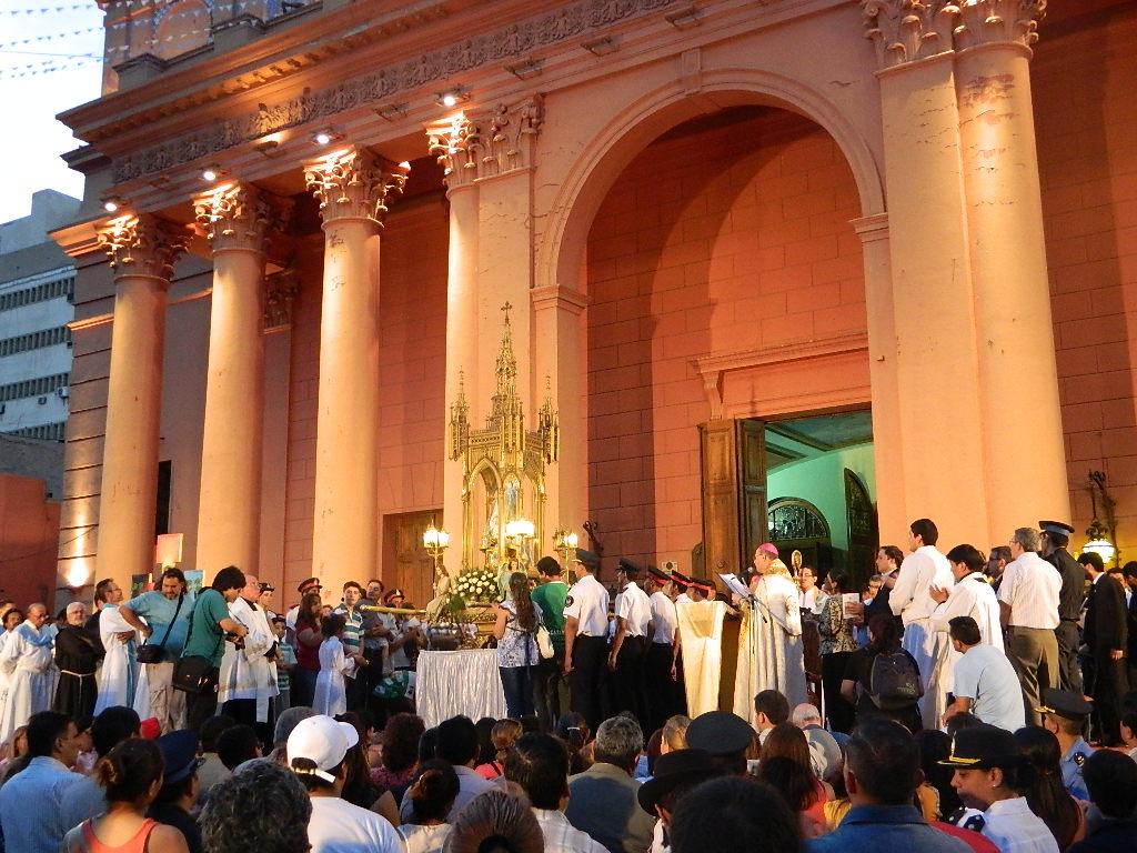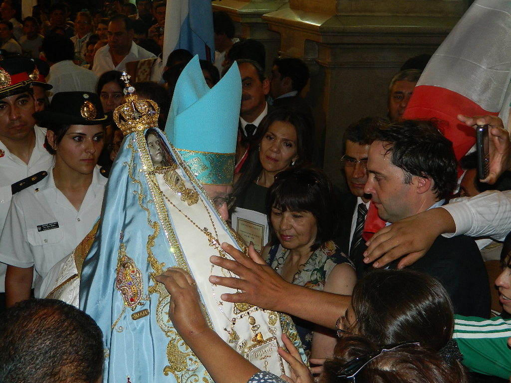 A las 18 salió la Imagen cuatro veces centenaria desde el interior del templo catedralicio, precedida por los seminaristas, los sacerdotes del clero local y de comunidades religiosas, seguidos por el Obispo Diocesano Mons. Luis UrbanÄ, quienes se ubicaron en el tarimado levantado delante del atrio. Allí, junto a la multitud ubicada detrás de los vallados, recibieron jubilosos a la Imagen de la Santísima Virgen, que salió al encuentro de sus hijos portada por personal de Infantería de la Policía de la Provincia y escoltada por gauchos de diferentes agrupaciones -quienes llevaban las banderas papal y argentina, como también de los países latinoamericanos- y la Guardia de Honor de la Policía Provincial.