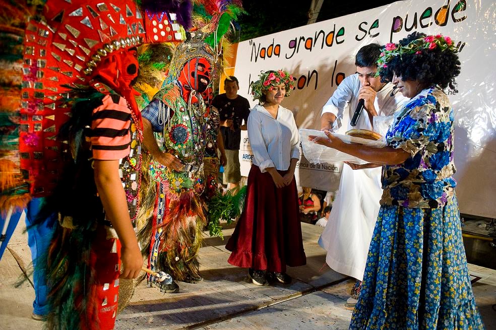 Las comparsas tradicionales “Diaguita”, de Mutquín y “La Villa”, de Pomán, con sus coloridos trajes emplumados, llamaron la atención de todos los presentes, sobre todo cuando realizaron el tradicional topamiento. Con la participación de los personajes típicos del carnaval norteño –el viejo, la vieja, el diablo, el cura- también representaron el bautismo de la guagua de pan, que finalmente fue compartida entre los presentes.