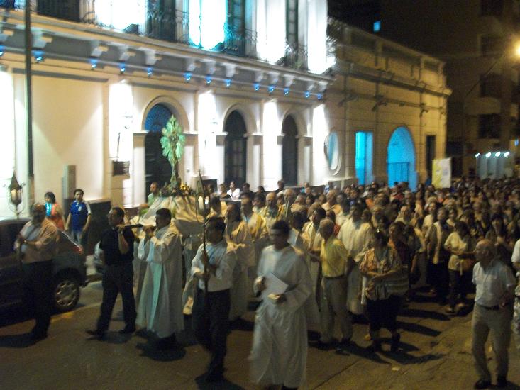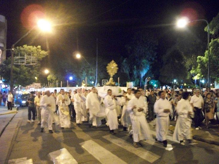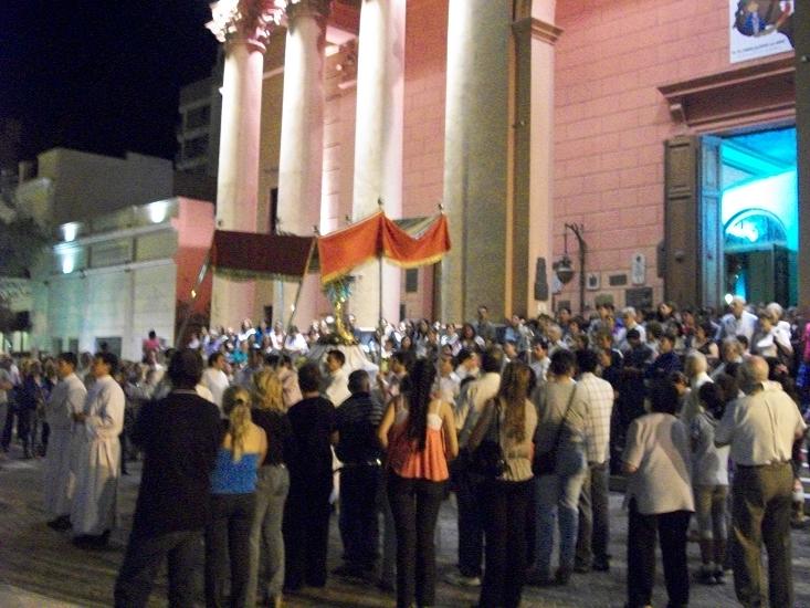 Finalizada la celebración eucarística, y luego de un momento de oración frente a Jesús Sacramentado, se concretó el Vía Crucis por las calles ubicadas alrededor de la Catedral. El trayecto comprendió las calles República, Maipú, Chacabuco y Sarmiento, llegando nuevamente al Santuario Mariano. La marcha hizo una parada frente a la Capilla del Buen Pastor, donde se rezó la oración de desagravio por las ofensas a Jesús Eucaristía.