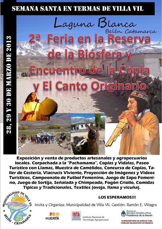Estos eventos tendrán lugar del 28 al 30 de marzo en la localidad de Laguna Blanca, departamento Belén. Se contará con la exposición y venta de productos artesanales y agropecuarios locales, corpachada a la “Pachamama”, coplas y vidalas, paseo turístico en llama, muestra de camélidos, concurso de coplas, taller de cestería, viacrucis viviente, comidas típicas y diversas actividades culturales. A través de estas actividades, los festejos de Laguna Blanca buscan conservar la poesía y el canto de la zona e incentivar la conciencia para la protección de la flora y fauna nativa.