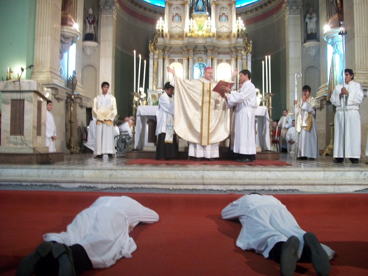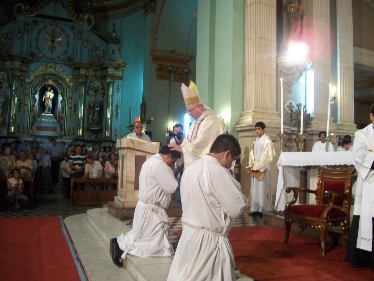 Finalizada la homilía, se dio paso al rito de la ordenación diaconal en el que Facundo y Eduardo renovaron el compromiso de celibato y la promesa en la que expresaron la voluntad de recibir este Sacramento. Luego los presentes pidieron a Dios para que derrame generosamente sus dones sobre estos elegidos para el ministerio del diaconado. Entonces los dos jóvenes se postraron totalmente en tierra y se cantaron las letanías. A continuación, el Obispo les impuso las manos elevando la plegaria de Ordenación y los padrinos de cada uno les impusieron la estola según el modo diaconal y los revistieron con la dalmática. (La estola es una banda larga y estrecha que cuelga del cuello, utilizada por los diáconos en forma diagonal para la celebración de los sacramentos. La dalmática es la vestidura que representa el reinado de Cristo, y que el diácono se coloca sobre la estola para el ejercicio de su ministerio). Ya con sus vestiduras diaconales, se acercaron al Obispo, se colocaron de rodillas y Mons. Urbanc les entregó el libro de los Evangelios, diciéndoles: \"Recibe el Evangelio de Cristo, del cual has sido constituido mensajero; cree lo que lees, enseña lo que crees y practica lo que enseñas\".