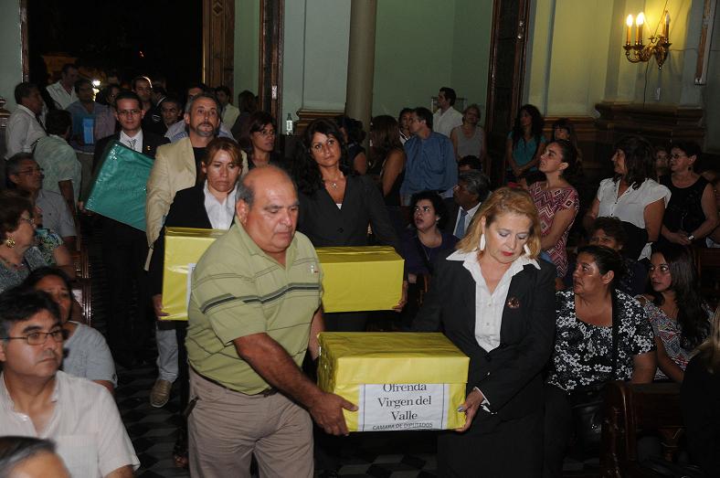 Las ofrendas materiales fueron encabezadas por los niños del Coro Municipal, seguidos por innumerables fieles representantes de los diversos sectores alumbrantes. Finalmente los dones eucarísticos fueron acercados al altar por el Vicegobernador Dalmacio Mera Figueroa, el Presidente de la Cámara de Diputados, Néstor Tomassi, y el director de Cultura municipal, Lic. Ariel Aredes.