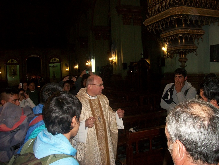Anoche, finalizado el homenaje de los jóvenes, Mons. Luis Urbanc saludó a un grupo de ellos, intercambiando saludos e impartiéndoles la bendición.