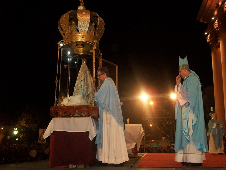 La celebración eucarística de las 21.00 fue presidida por el Obispo Diocesano, Mons. Luis Urbanc, en el atrio de la Catedral Basílica, y concelebrada por el Vicario General de la Diócesis, Pbro. Julio Quiroga del Pino, el Delegado Episcopal para la Pastoral Familiar, Pbro. Eduardo López Márquez, el Rector del Santuario Mariano, Pbro. José Antonio Díaz, y sacerdotes del clero local y de Comodoro Rivadavia.