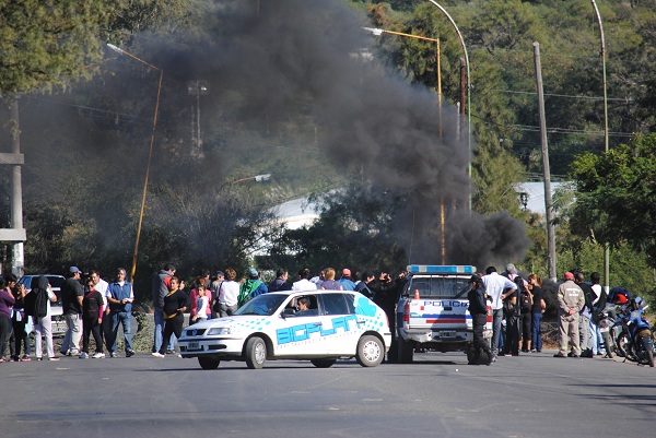 La protesta de los municipales se cumple a la altura del Club de Bioquímicos, en Tres Puentes, donde los empleados allí reunidos quemas neumáticos, e interrumplen la circulación hacia Capital por la Av. Pte. Castillo.
