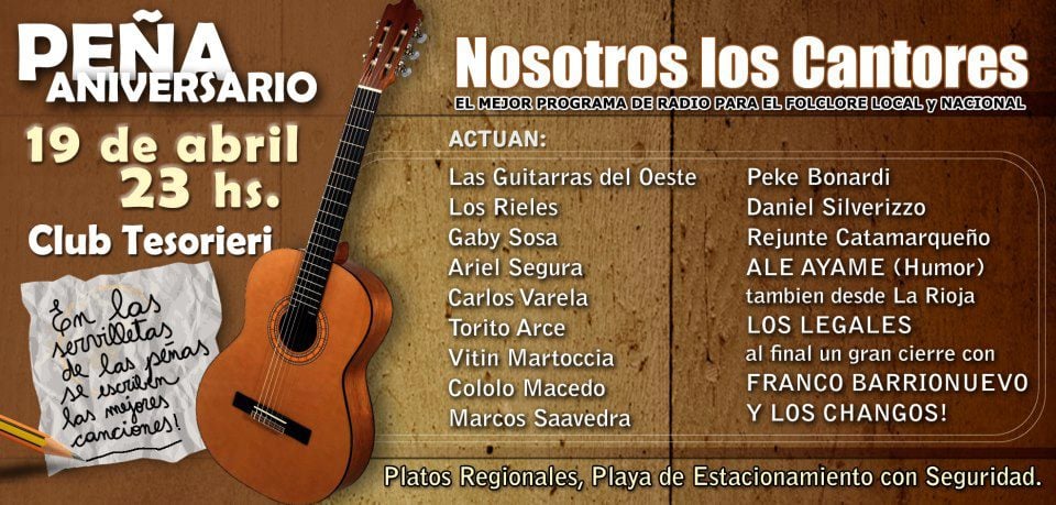 Este viernes desde las 23 horas en el club Américo Tesorieri se realizará una gran peña denominada Nosotros Los Cantores con las destacadas actuaciones de mas de 15 artistas locales.