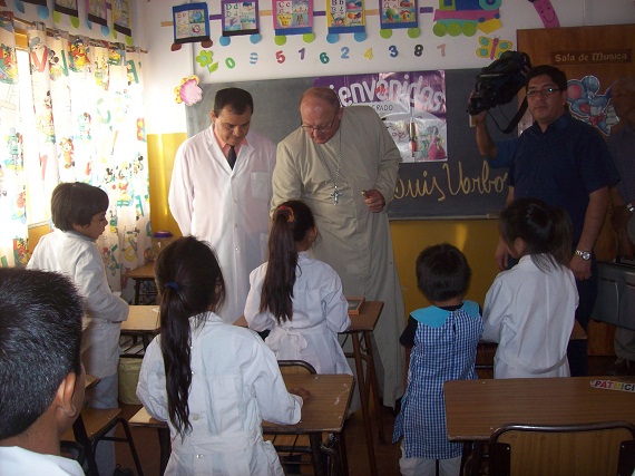 Luego de compartir la oración de Laudes y un desayuno con periodistas de los medios de comunicación locales, con quienes dialogó sobre distintos temas de actualidad, alrededor de las 10.00, Mons. Urbanc partió hacia la localidad de Anillaco, distante a unos 23 kilómetros de la cabecera departamental, atravesando el río La Troya, para llegar a la escuela N° 431, donde además de la comunidad educativa lo esperaban los vecinos junto con el delegado comunal Francisco Espinoza. El acto de bienvenida se desarrolló en el interior del edificio escolar, donde la maestra Orieta Suaso, a cargo de la dirección, expresó la alegría de contar la presencia del enviado de Cristo “en nuestra humilde casa de estudios”, lo cual se manifestó luego con cantos y gestos de los niños.