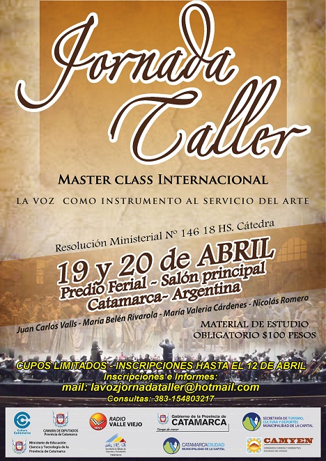 El curso, que se realiza con el apoyo de la Secretaría de Cultura, se llevará a cabo los días 19 y 20 de abril en el salón principal del Predio Ferial Catamarca, e incluye temas como fisiología de la fonación; principios básicos para la impostación y colocación de la voz; técnicas vocales; mecanismos de respiración; y relajación.