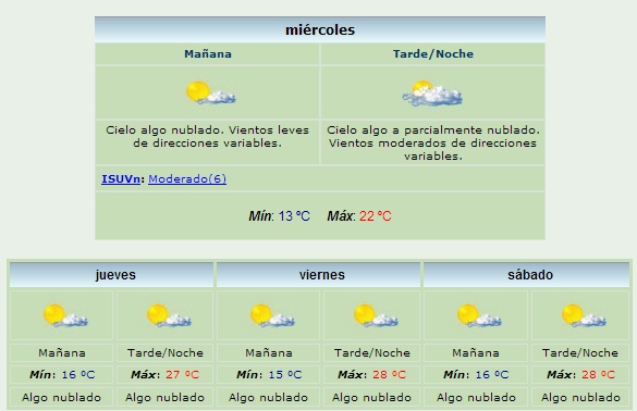 Ya para el fin de semana, el sábado se registrará una mínima de 16º y una máxima de 28º y durante toda la jornada estará algo nublado. Tampoco se pronostican lluvias para este día.