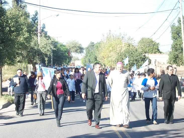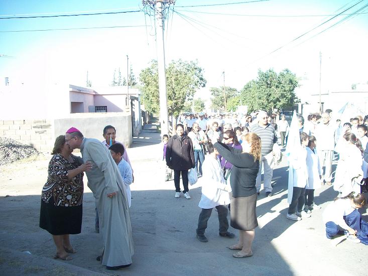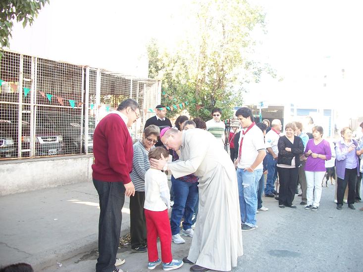 La intersección de las avenidas Ares de Vildoza y Acosta Villafañe fue el punto donde lo esperaron el Cura Párroco, Pbro. Reinaldo Oviedo, acompañado por el Capellán de la Policía de la Provincia, Pbro. Angel Nieva, el concejal del circuito, Dn. Víctor Hugo Rodríguez, alumnos y docentes de la escuela N° 296 Pte. Dr. Ramón S. Castillo, Cadetes de la Escuela Superior de la Policía de la Provincia, y un buen número de fieles, que se dieron cita en la soleada mañana para asistir a este importante acontecimiento en la vida de esa comunidad. Luego de saludar a todos los presentes, desde este lugar marcharon a pie hasta el templo, donde participaron de la adoración al Santísimo.