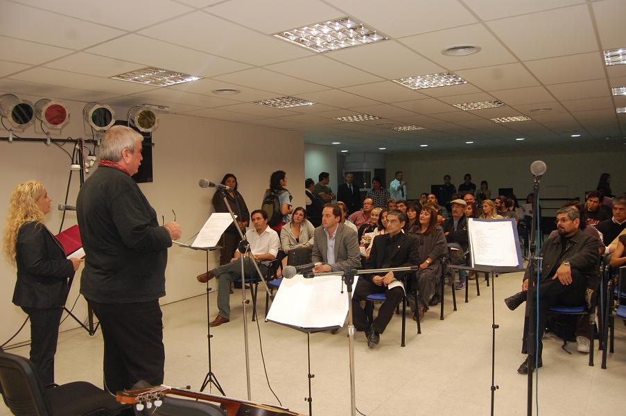 Héctor Pianetti en representación de los actores fue el encargado de dirigirse al público presente, “Nosotros somos actores, constructores de la palabra, a través de nuestra profesión, nuestra herramienta, nuestro instrumento, le dedicamos este pequeño homenaje”. De esa manera y a través de una perfecta combinación de canciones y poemas, junto a la melodía de Federico Miranda, el actor inicio junto a Roberto Alvarenga y Mariela Sosa, una obra teatral “La palabra” para el público presente.