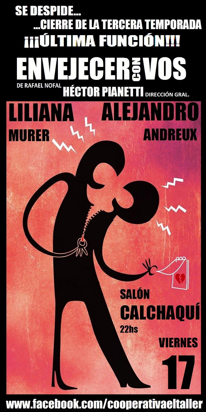 La Cooperativa Artística Cultural “El Taller” presentará este viernes 17 de Mayo a las 22 horas, en el Salón Calchaquí, la obra “Envejecer con vos” con la dirección general de Héctor Pianetti, las actuaciones de Liliana Murer y Alejandro Andreux y música de Marcelo Chabur.