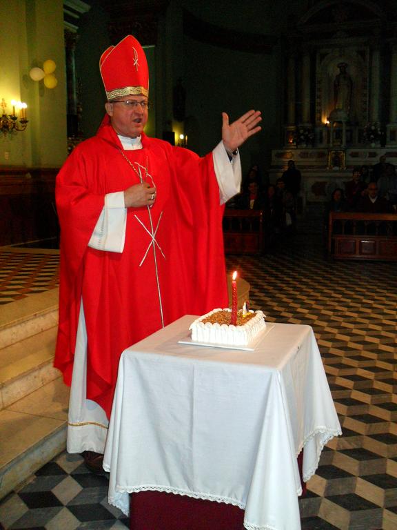 Después de la bendición, se invitó al Obispo a soplar la velita por un nuevo aniversario de la Iglesia, mientras se cantaba el Cumpleaños Feliz.