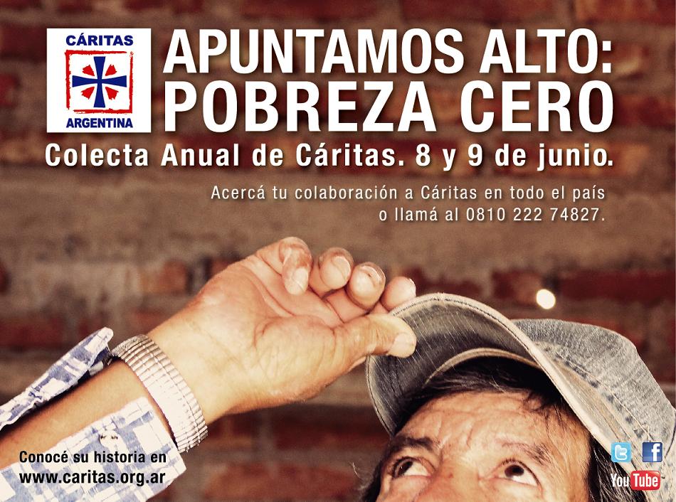 Este año 2013 la Colecta se realizará el sábado 8 y el domingo 9 de junio bajo el lema “Apuntamos alto. Pobreza Cero”, que queda enfocado por el mensaje “Apuntamos alto”. Así Pobreza Cero es un objetivo al que “apuntamos”, que anhelamos alcanzar todos y es “alto” no sólo por su magnitud social sino también por su sentido trascendente que invita a elevar nuestra mirada.