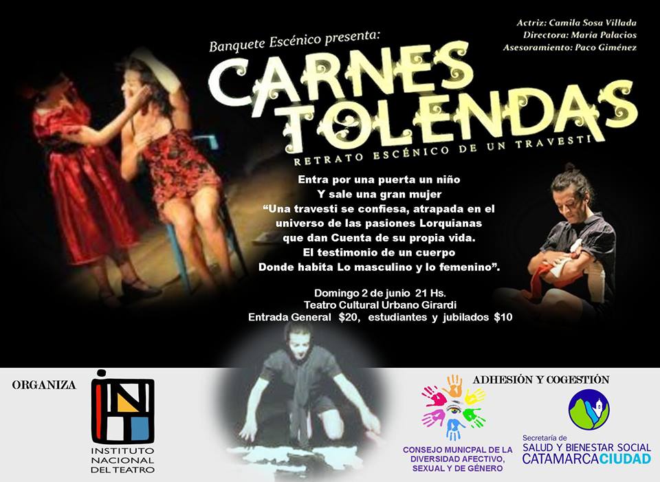 “Carnes Tolenda”, es una obra que se proyecta hacia un público adulto, con una duración de 50 minutos. La dirección está a cargo de María Palacios y con la formidable actuación de la actriz Camila Sosa Villada, quien fuera intérprete en la película “Mía” y “La Viuda de Rafael”.