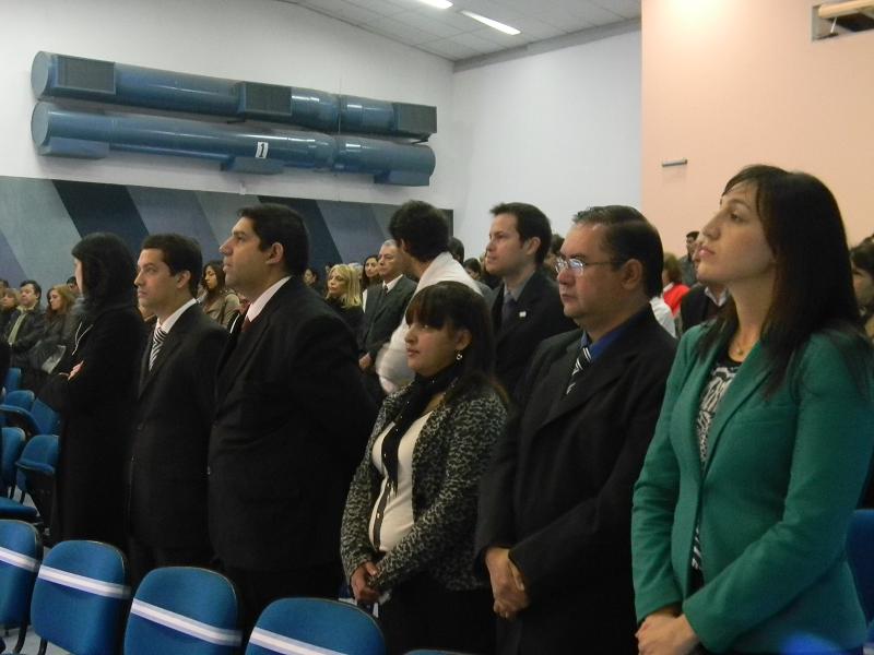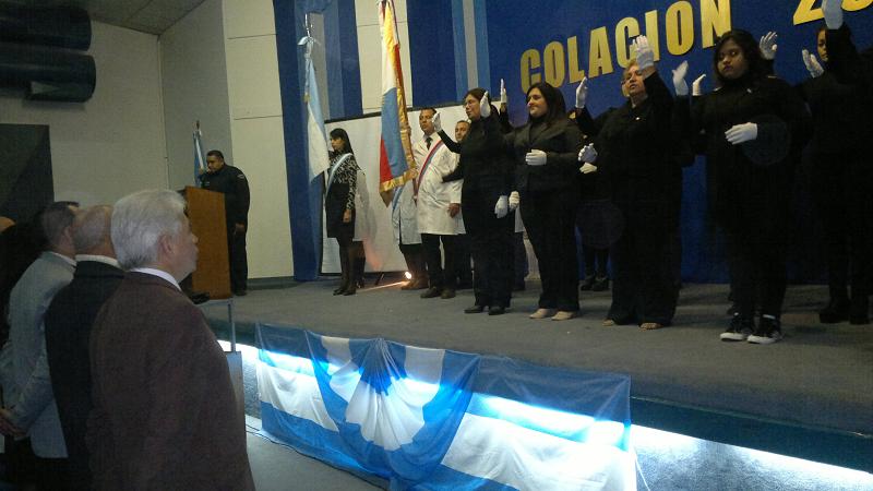 Posteriormente, dio inicio al acto de colación con el ingreso de las banderas de ceremonias: abanderada, Lic. Eva Silva, primer escolta, Lic. Hilen Páez Flores y segunda escolta, Dra. Silvia Mugas quienes entregaron las insignias nacionales a la abanderada, Dra. Alina Cabrera, primera escolta Dr. María Laura Pinela y segunda escolta Dra. Alejandra Bernal.