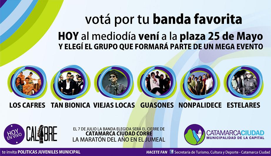 Desde el área aseguraron que la idea es generar un simulacro de voto para los estudiantes en el cual Los Cafres, Tan Bionica, Viejas Locas, Guasones, Nonpalidece y Estelares serán las bandas a elegir, y la que resulte ganadora cerrará el espectáculo luego de la maratón, el próximo 7 de julio en el dique El Jumeal.