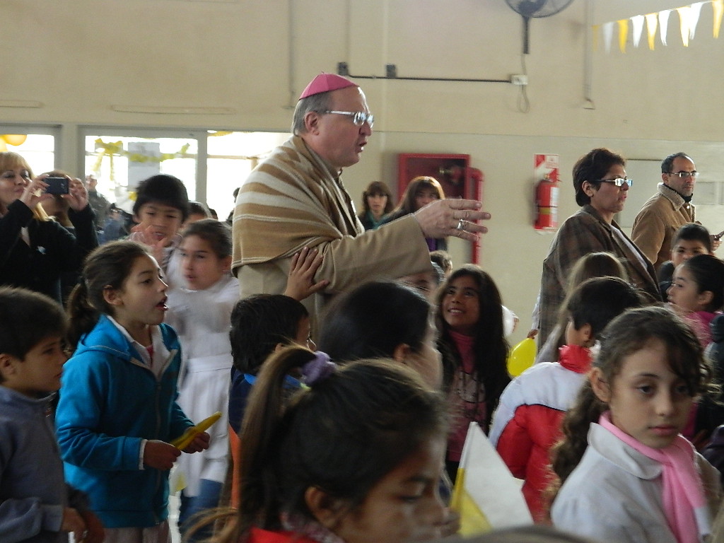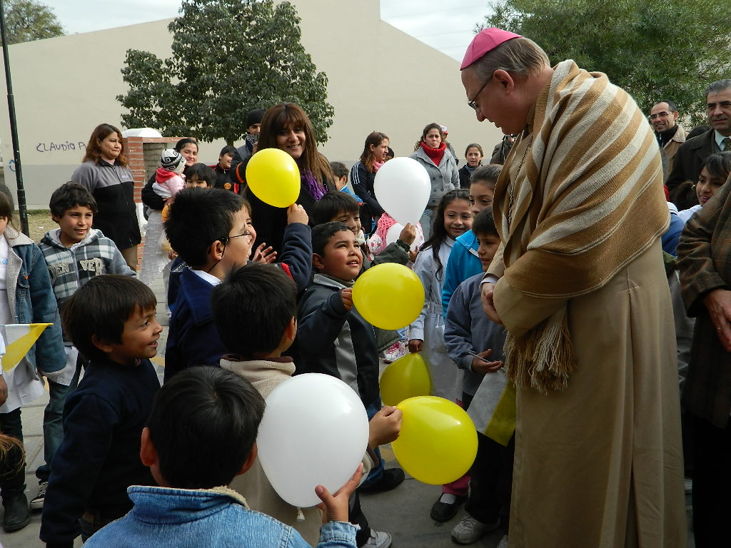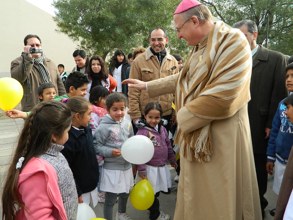 Pasadas las 10.30, Mons. Urbanc se trasladó hasta la escuela N° 428 Dr. Enrique Ocampo, ubicada camino a El Jumeal, que se vistió de fiesta para darle la bienvenida al Pastor Diocesano. Ubicados en el ingreso del establecimiento educativo, con mucho entusiasmo, los pequeños del Nivel Primario, junto a los directivos y docentes le brindaron un alegre recibimiento en la fría mañana.