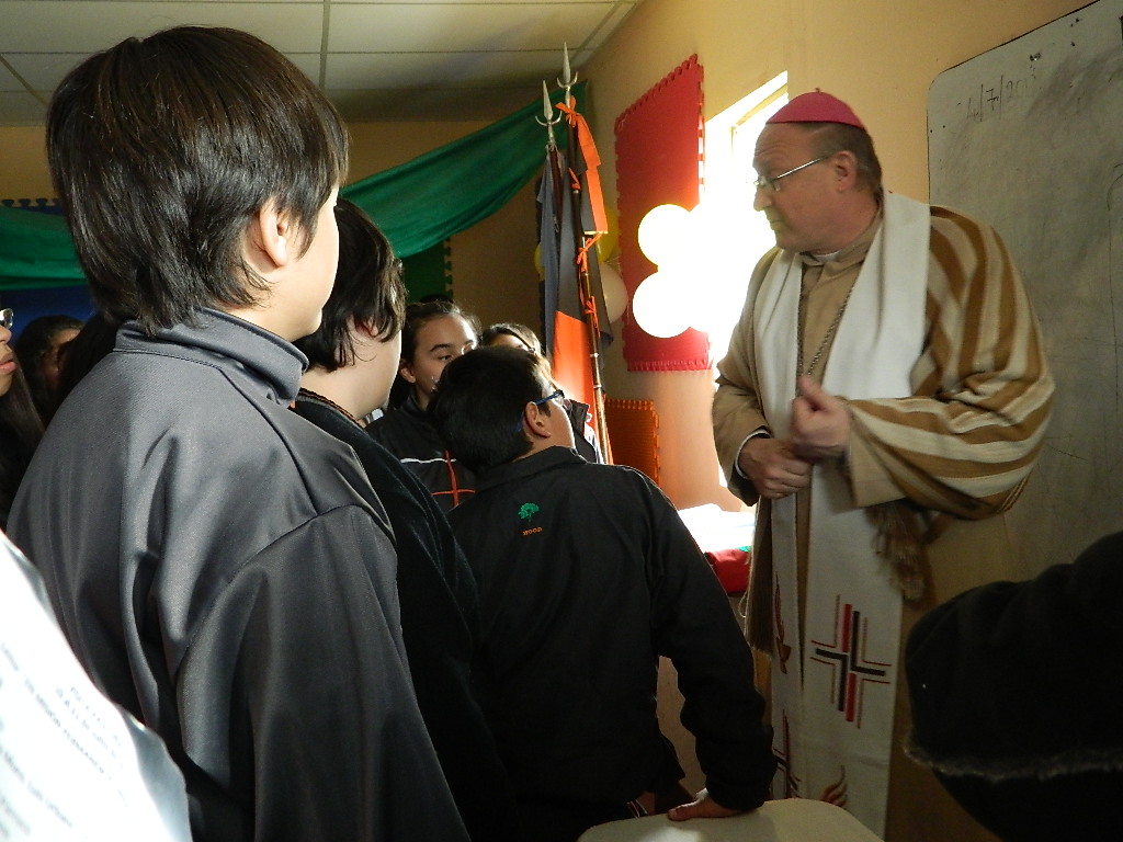 La ocasión fue propicia para que Mons. Urbanc explicara el significado de los símbolos del Obispo como la cruz pectoral, el anillo, el solideo, la mitra y el báculo, momento seguido con respeto e interés por parte de los estudiantes y los docentes que los acompañaban.