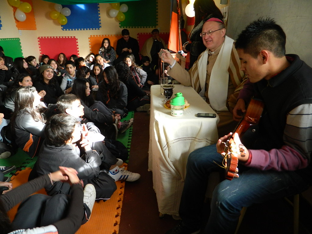 Allí fue saludado por el personal docente y guiado hasta una de las salas de la planta alta donde rezó con alumnos del Nivel Secundario, quienes se sentaron en el piso, generando un ambiente de cercanía, para compartir un fecundo diálogo construido a partir de las inquietudes surgidas sobre la fe.