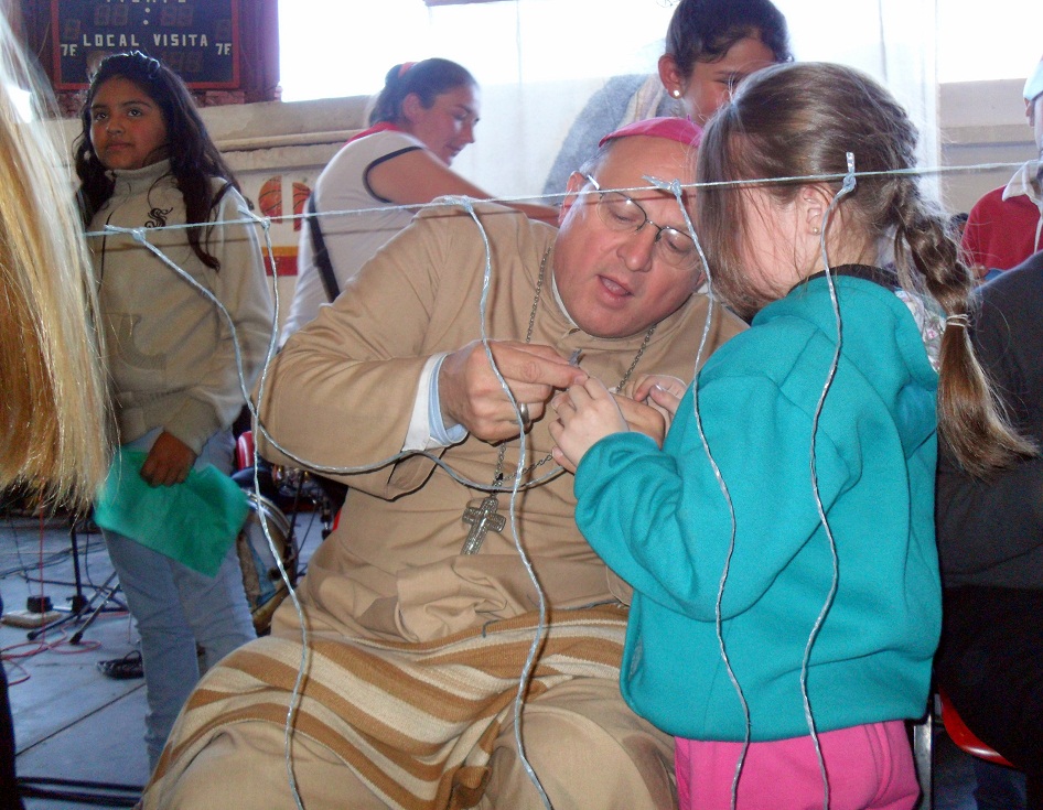 A su llegada, el Obispo recorrió el estadio saludando a los presentes, quienes luego reflexionaron sobre el pescador de hombres y trabajaron tejiendo todos juntos una gran red que cubrió toda la instalación deportiva.