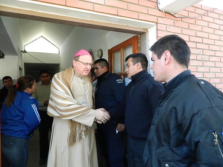 Desde el centro de salud, se dirigió a pie hasta la Unidad de Investigaciones Judiciales N° 8, y de allí hasta la Comisaría Octava, donde saludó al personal policial y visitó a los detenidos en esa dependencia y rezó por ellos.