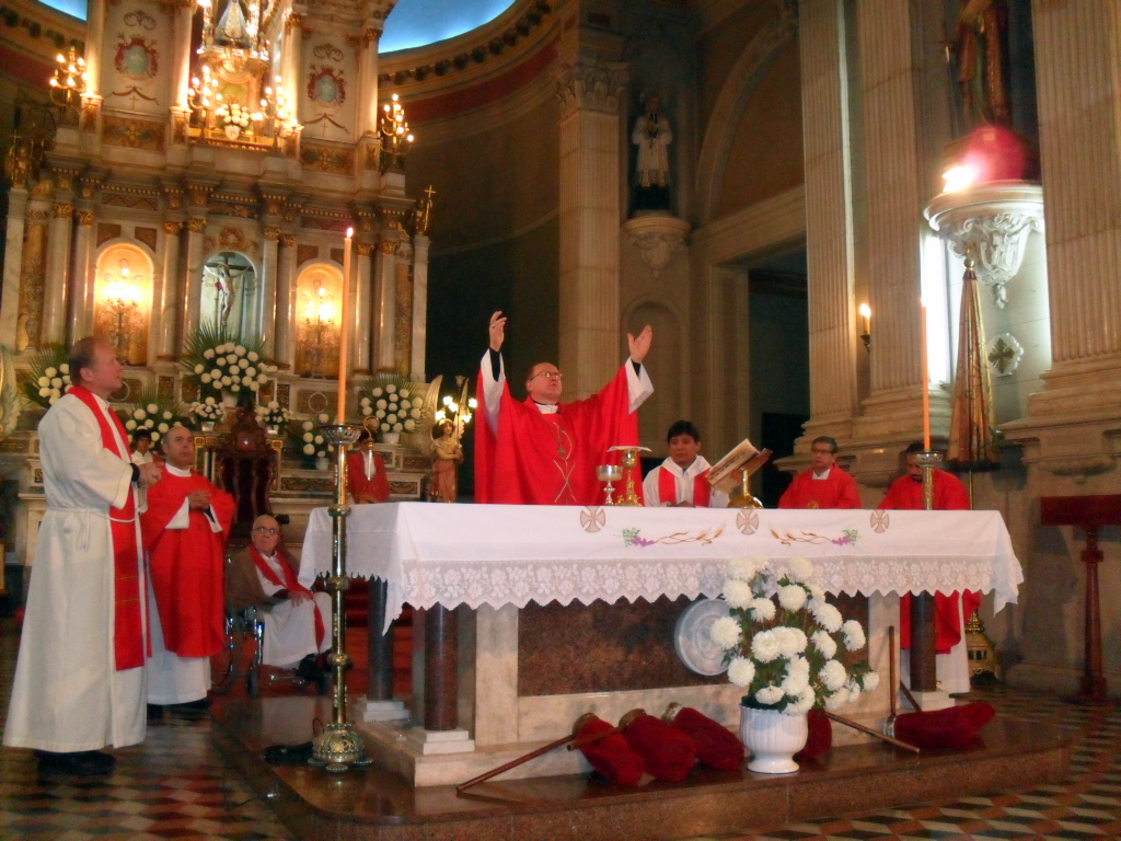 Durante su homilía, el Obispo reflexionó sobre la Carta del apóstol Pablo, quien “nos dice que nadie puede decir Jesús es el Señor si no es movido por el Espíritu Santo; para reconocer que Dios es Padre necesito la fuerza del Espíritu Santo. Creo que si cada uno analiza un poquito su propia vida se dará cuenta cuán frágil es… y cuando el ser humano no está unido a Dios, utiliza sus capacidades en contra del mismo ser humano. Por eso vemos cuánto desastre hay en el mundo. De allí que el apóstol decía en este texto que llevamos un tesoro en vasijas de barro. Esa es la figura que utiliza el apóstol para hablar de la fragilidad esencial que nosotros tenemos. El tesoro que llevamos en esa vasija de barro pone en evidencia la grandeza del tesoro, y Dios confía este tesoro a cada ser humano, porque nosotros somos imagen y semejanza de Dios. Y así, en esa fragilidad actúa Dios para que cada uno lleve su Palabra al mundo”.