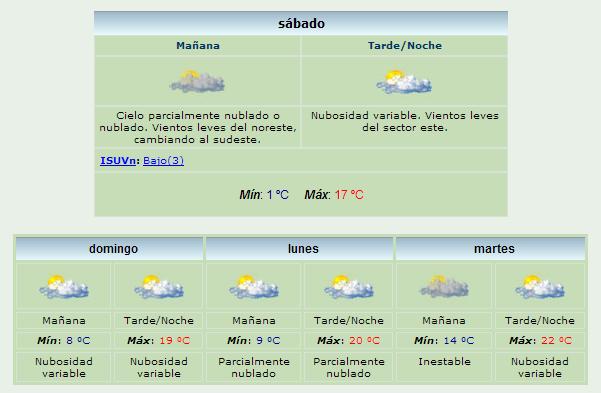 Según el pronóstico extendido del Servicio Meteorológico Nacional, la temperatura hará que los próximos días sean más que agradables. No están anunciadas lluvias y para el martes se espera que la máxima sea de 22°. La temperatura mínima, en tanto, paulatinamente comenzará a subir por lo que las mañanas no serán tan frías. Conozca cómo estará el clima.